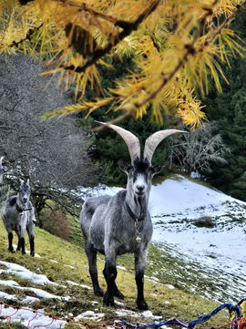 «Ich bin eine Capra Grigia oder auch Cavra del Sass genannt, eine der seltensten Ziegen der Schweiz und komme aus den südlichen Alpentälern.»